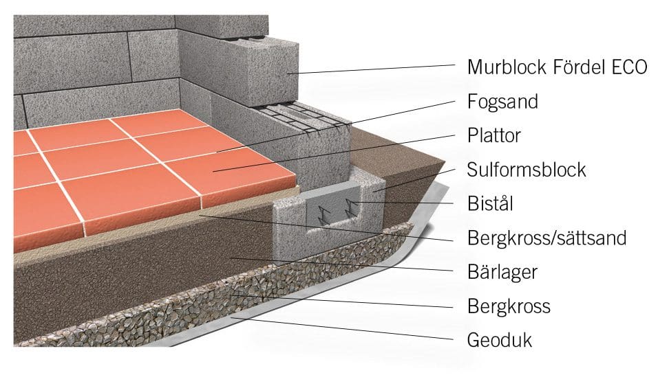 Blanda Murbruk B enligt anvisningarna på förpackningen. Lägg ut bruket med mursleven på sulformsblocken och mura upp ett skikt Murblock Fördel ECO. Fogens tjocklek ska vara ca 10 mm och inget bruk läggs i de vertikala fogarna.