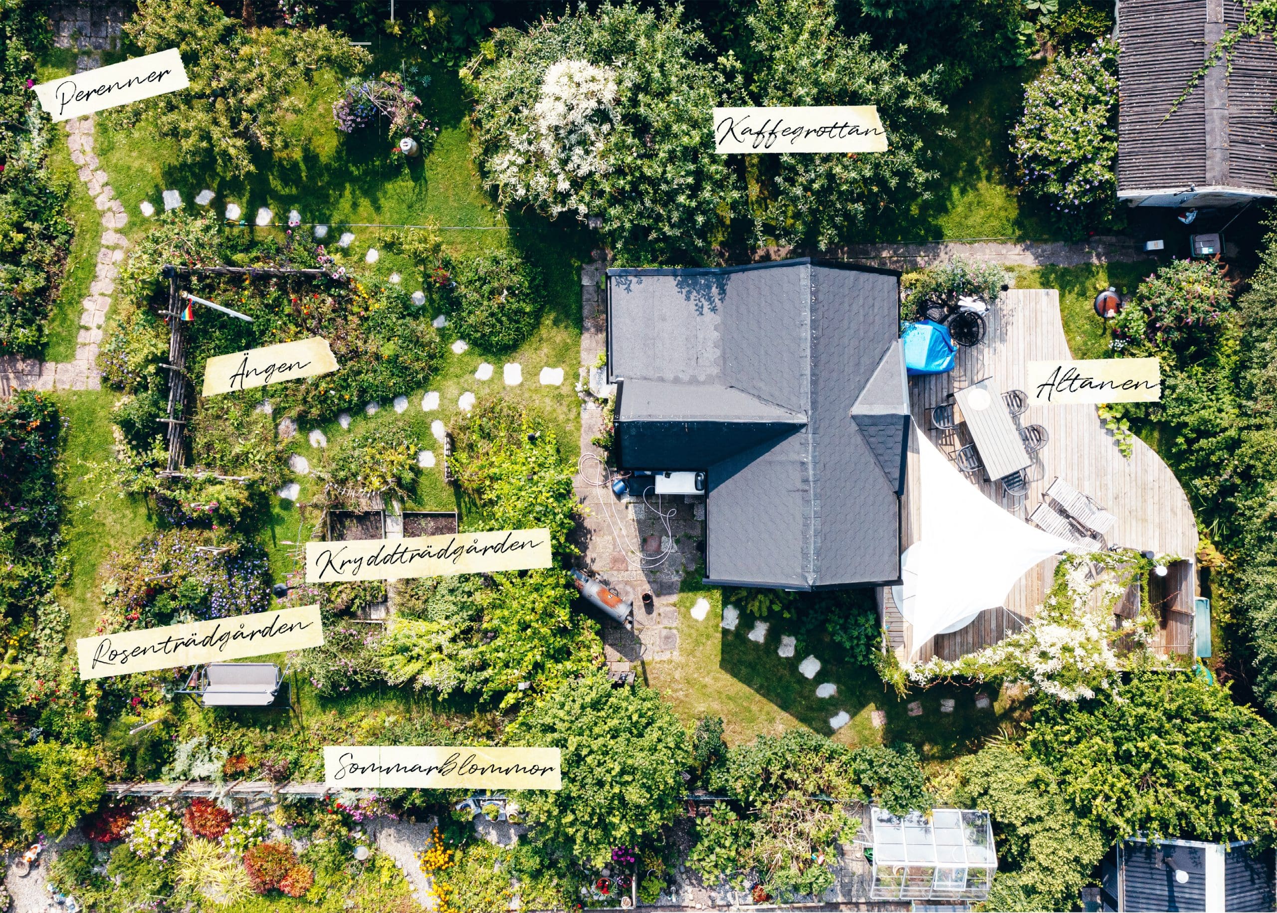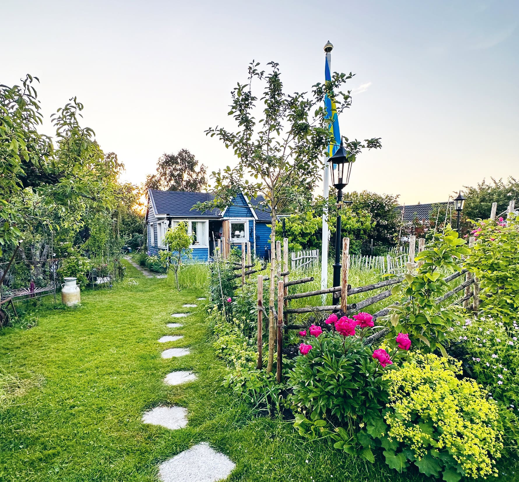 Idag är kolonin en grönskande oas med plats för både arbete och vila. På de 500 kvadratmetrarna samsas en väldoftande rosenträdgård med en blomstrande äng och en solig altan med kryddträdgård alldeles intill. För Rickard, som gärna unnar sig en fika, finns här också en självklar skånsk specialitet – en kaffegrotta!