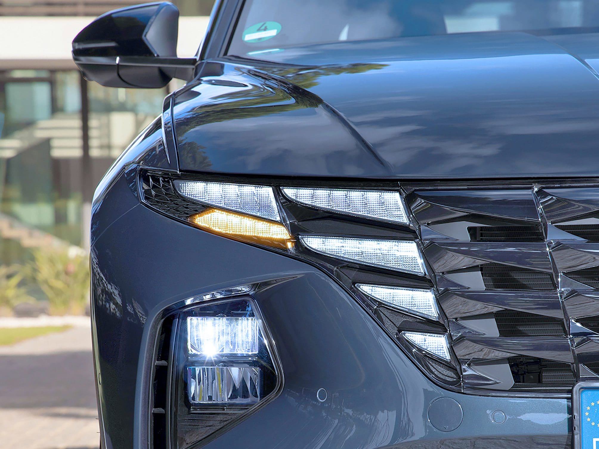 När koreanerna beskriver nya Tucson 2021 som en ”teknisk evolution och designrevolution” så tänker vi först mycket snack och lite verkstad. Men efter att ha provkört bilen ute i den bistra verkligheten så får de nötta bokstäverna ändå den sortens tyngd som bara sanningen kan skapa. När det gäller den tekniska evolutionen så siktar man kanske lite väl högt på himlen – det är betydligt lättare att bekräfta designrevolutionen. Förutom allmänt snitsiga linjer så är det den tuffa grillen med integrerade lysen som verkligen sticker ut.