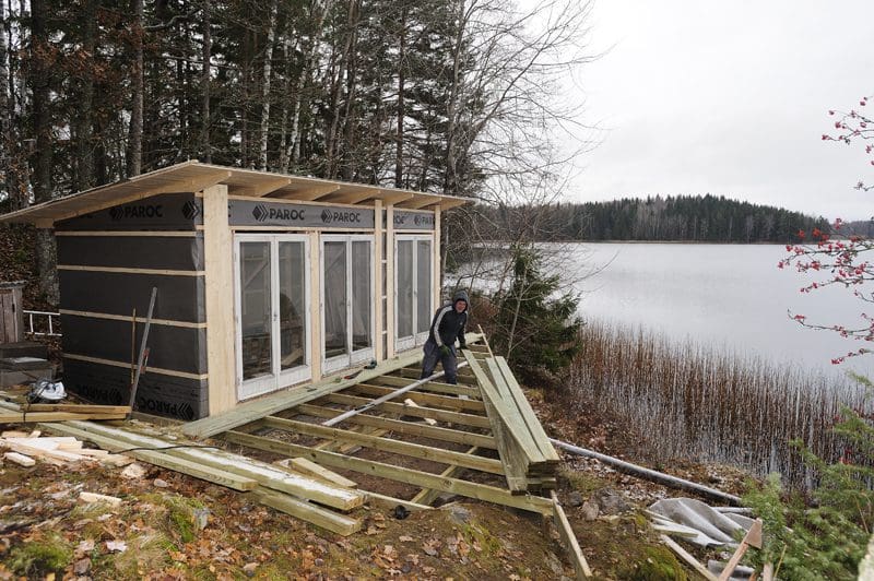 Nu sätts taket upp och horisontell råspont på väggarna. Ett erbjudande på ett byggvaruhus om skjutdörrar bestämde hur rummet skulle avdelas. Två vita och en av glas. En vägg med en 40 cm djup garderob byggdes. Transporten av glasdörren på en bilkärra på skumpiga vägar blev en prövning. Uteduschen byggdes av läkt på trädäcket, på ena gaveln. En varmvattensberedare kommer senare. Vattnet pumpas från sjön. Elinstallationen slutfördes. Spotlights i taket och utvändiga lampor monterades.