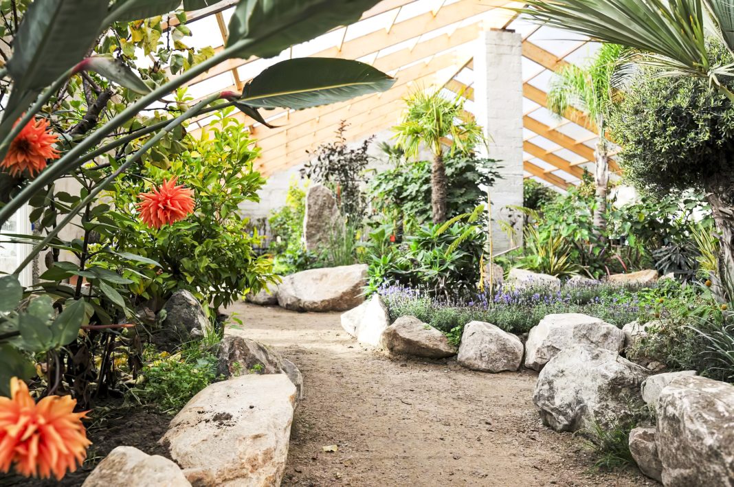 Hemligheten är jordens naturliga värme. Gräv ner växthuset djupt nog och kylan håller sig på avstånd medan solens energi fångas in och stannar kvar. Det räcker för att odla subtropiska växter helt utan uppvärmning.