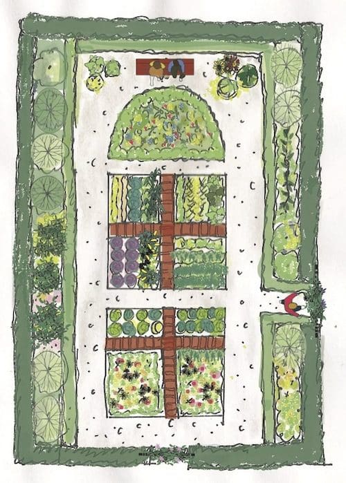 En köksträdgård kan utvecklas till att bli ett fantastiskt trädgårdsrum och till en potager! Det här exemplet omgärdas av klippta häckar. Grindar med rosenbågar eller kanske bönor som klättrar. Bärbuskar på sidorna som omgärdas av infattningshäckar av något slag. Här kan du slå dig ner på en bänk intill krukorna med kryddor. Snittblommor i halvmånen och grönsaker av olika slag i odlingsbäddarna. Varför inte en tegelgång så du lätt kan komma åt!