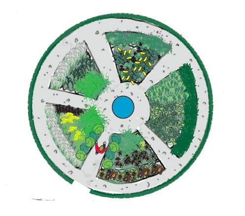 2. En cirkulär form kan vara spännande. Omgärdat av låg infattningshäck , gångar av singel och ett fågelbad i mitten!