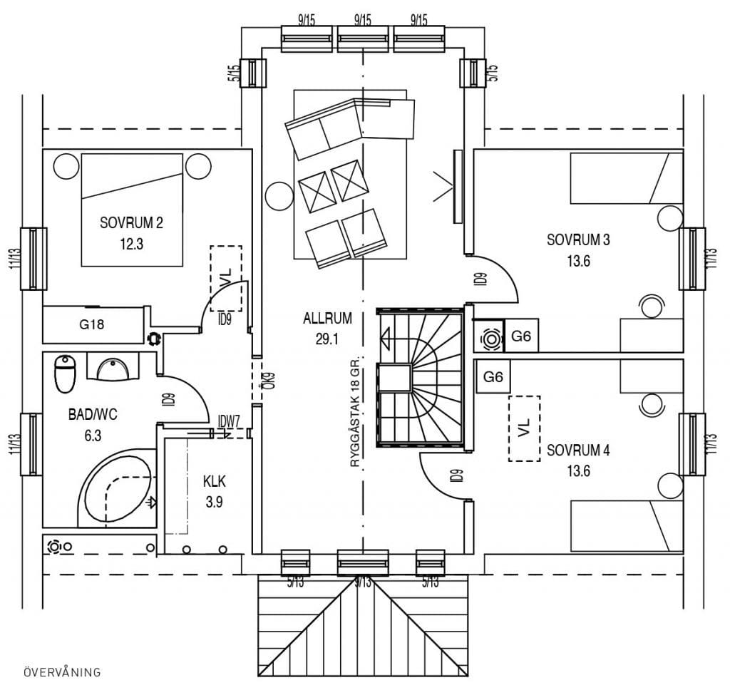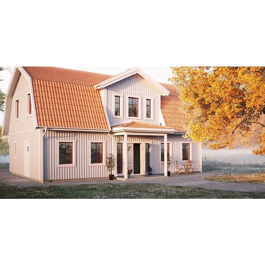 Daggkåpa är ett rejält hus med gott om plats. När vi ritade husets planlösning tänkte vi oss en stor familj, kanske med ytterligare tillväxtplaner. Arbetsrummet/gästrummet på nedervåningen kan nämligen ta rollen som föräldrasovrum om familjen utökas. Även köket är riktigt stort, vilket underlättar både julfiranden och söndagsmiddagar. En trappa upp får barnen rejält med svängrum och ett eget allrum med högt i tak.