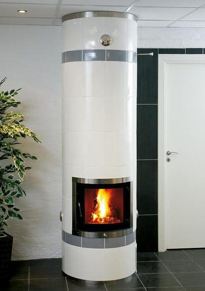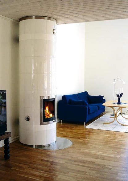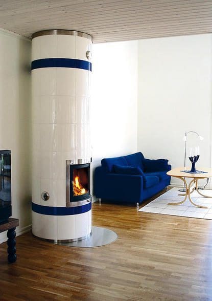 Vitt blankt kakel med blått dekorband och kassettram i rostfritt borstat stål. Här ger den klassiska vita nyansen, tillsammans med modernt formspråk, härlig retrokänsla i det nybyggda huset nära havet på Öland.