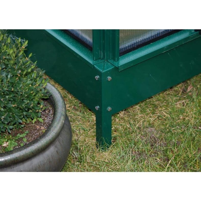 Levereras med 4 fönsterluckor och 2 skjutdörrar som standard. Växthuset har 6 mm 2-skikts hållfasta polykarbonatskivor i tak och väggar och solid aluminiumram. Går även att beställa med 4 mm säkerhetsglas i sidorna. Komplettera med original sockel, är i galvaniserad plåt och finns som tillval, 15 cm hög, vilket ger en stabil och bra grund. Det går också bra att själv bygga en sockel.