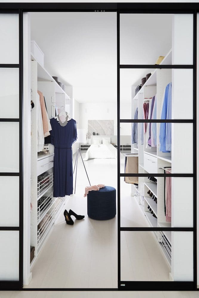 Dressingroom med vit inredning Skjutdörrar med profil Titan svart, kombinerat med glasfyllning.