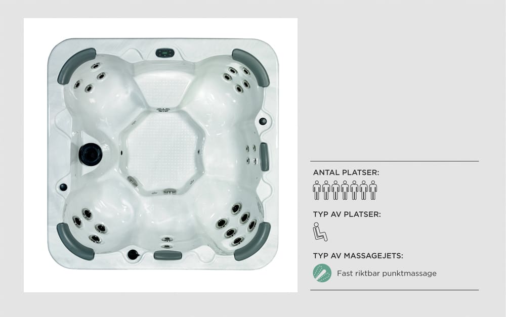 Sju platser varav fyra är komfortabla hörnsäten. Spabadet är utrustat med riktbara massagejets i olika storlekar. Dessa är även placerade på olika höjd och bredd mellan varandra, för att skapa en så bred och mångsidig massage som möjligt.