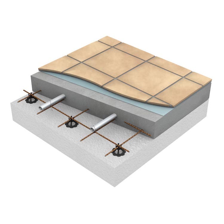 Värmeslingor lagda på armering och ingjutna i betong. Golvvärmerör 20 najas mot armeringsnätet och gjuts därefter in och täcks med min 30 mm betong.