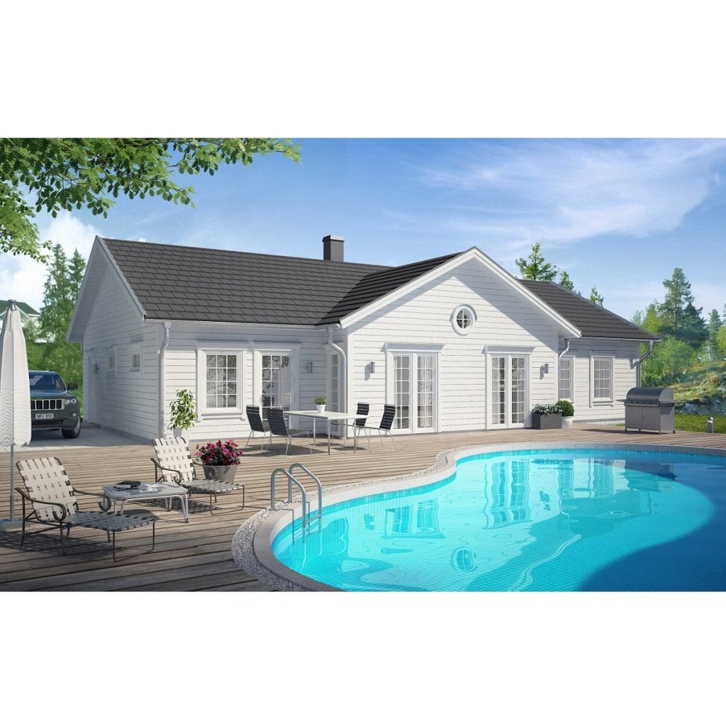 Härlig enplansvilla i New England-stil. Huset har en praktisk uppdelning i två separata sovrumsdelar för barn respektive föräldrar, med gemensamma ytor i mitten. I vuxendelen finns master bedroom med egen klädkammare och bad.