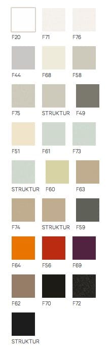Vedum erbjuder alla kulörer i NCS-skalan. Oavsett kulör har luckorna en vacker, beständig och lättskött yta. självklart använder vi miljövänliga färger utan kadmium och bly. Fem kulörer finns också med metalliceffekt. Eftersom strukturen och glittret gör att kulören avviker från originalkulören kan vi inte ange ett korrekt NCS-nummer och glanstal. Dessa fem kulörer kan också fås endast med struktureffekt utan glitter.