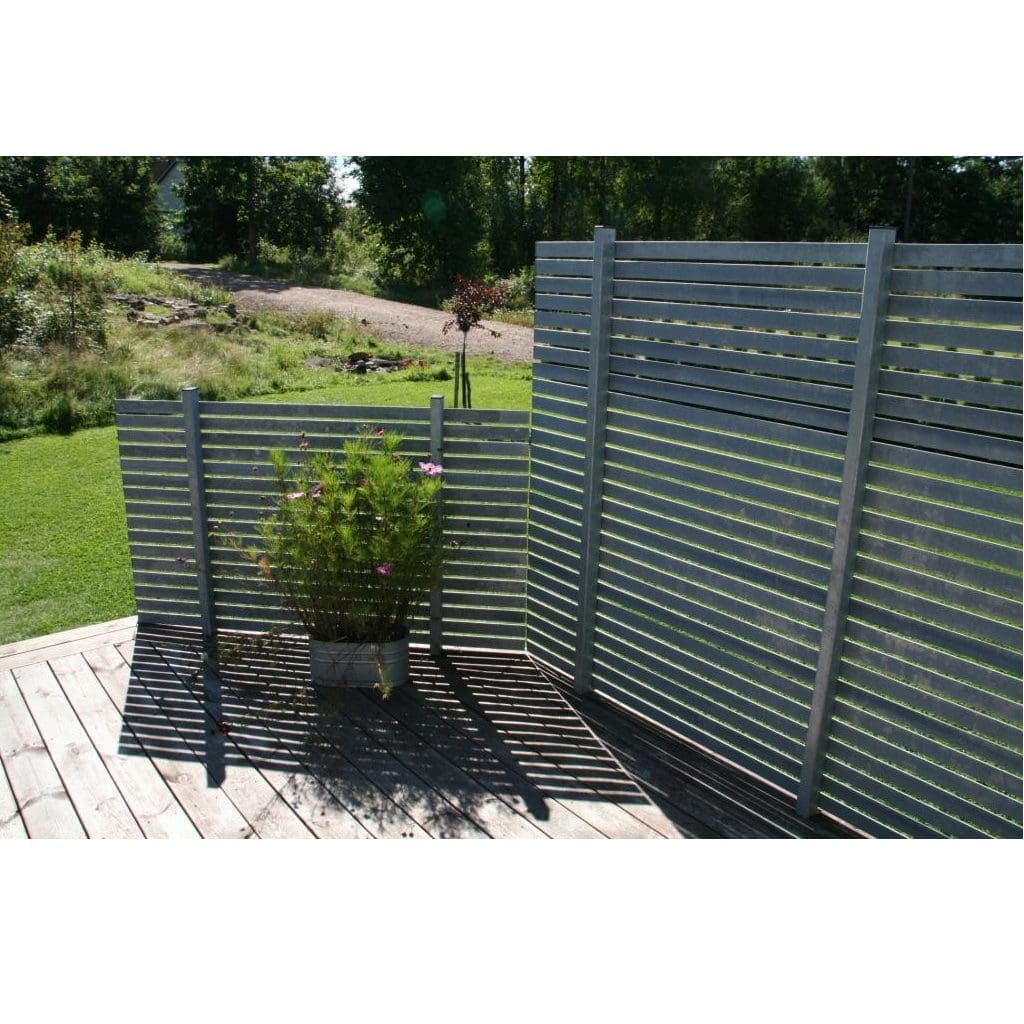 Underhållsfri avskärmning av varmgalvaniserat järn. Våra avskärmningar kan byggas i valfri höjd upp till 180 cm. och mellanrummet mellan de liggande plattjärnen bestämmer man vid montering.