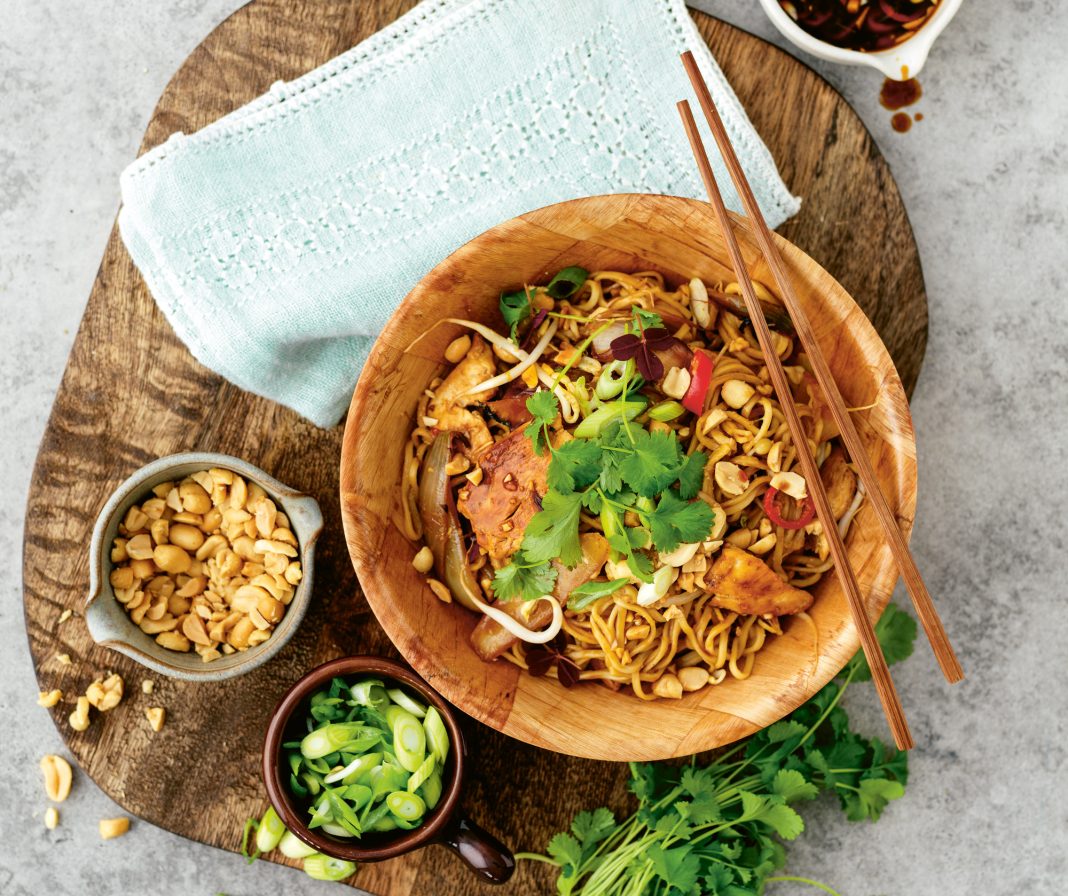 Strimla kycklingen (om du använder fryst är det lättare att strimla den när den ännu inte är helt tinad). Skala och skär den gula löken i klyftor. Skiva vårlöken. Koka nudlarna enligt anvisningarna på förpackningen.